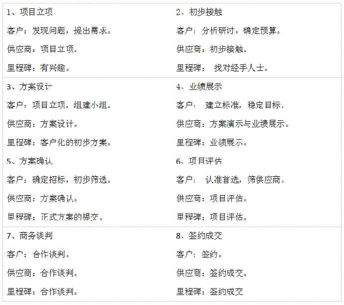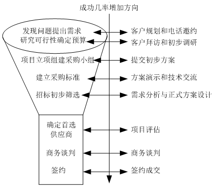 企業(yè)業(yè)務(wù)管控需要一套完善的管理系統(tǒng),我們這里特別設(shè)定企業(yè)業(yè)務(wù)管控系統(tǒng)。它不僅僅是一種管理理念,同時(shí)也是一個(gè)管理體系、一個(gè)操作性很強(qiáng)的管理系統(tǒng)。 業(yè)務(wù)管控系統(tǒng)非常提倡過(guò)程管理,而且控制過(guò)程比控制結(jié)果更重要。在銷售中,一個(gè)銷售項(xiàng)目受到太多來(lái)自內(nèi)部和外部因素的影響,其結(jié)果的成敗與否是難以預(yù)測(cè)和控制的。 一、業(yè)務(wù)管控系統(tǒng)的特點(diǎn) 主要是讓原來(lái)只掌握在銷售人員手中的有關(guān)銷售過(guò)程的信息向銷售團(tuán)隊(duì)、銷售經(jīng)理和企業(yè)公開,使得: l 銷售人員的信息更加公開化,便于掌控客戶的進(jìn)展; l 讓項(xiàng)目的銷售過(guò)程更加明確化,標(biāo)準(zhǔn)化,系統(tǒng)化; l 便于項(xiàng)目?jī)?nèi)部的角色分工,使團(tuán)隊(duì)合作進(jìn)一步加強(qiáng); l 更好地做好銷售管理與銷售預(yù)測(cè)的工作; l 企業(yè)積累應(yīng)有的銷售知識(shí)和客戶資源。 二、企業(yè)業(yè)務(wù)管控系統(tǒng)的模型圖 如圖6-1所示。 ![]() 圖6-1 企業(yè)業(yè)務(wù)管控系統(tǒng)的模型圖 基礎(chǔ)組成要素:了解客戶內(nèi)部采購(gòu)流程 客戶內(nèi)部采購(gòu)流程是從客戶的角度對(duì)整個(gè)采購(gòu)過(guò)程一般必須經(jīng)過(guò)的步驟進(jìn)行劃分和描述。它通過(guò)跟蹤和記錄客戶采購(gòu)目前的狀態(tài)以及客戶、競(jìng)爭(zhēng)對(duì)手的回應(yīng),依據(jù)對(duì)內(nèi)部采購(gòu)流程的劃分,分析并確定目前客戶采購(gòu)所處的階段。讓我們更清晰的去了解,如何去對(duì)這八大流程階段進(jìn)行分析,該從哪幾個(gè)方面進(jìn)行著手。客戶內(nèi)部采購(gòu)流程包含八個(gè)階段如表6-1所示。 表6-1 八個(gè)階段表 ![]() 1、 發(fā)現(xiàn)問(wèn)題,提出問(wèn)題; 一般公司都是有現(xiàn)成的供應(yīng)商,我們的機(jī)會(huì)點(diǎn)就在尋找目前客戶與現(xiàn)有供應(yīng)商合作中的不滿意或者問(wèn)題,往往問(wèn)題越大,我們的機(jī)會(huì)點(diǎn)就比較有優(yōu)勢(shì)。所以,在采購(gòu)方的需求醞釀的階段,銷售方在這個(gè)階段介入明顯是最好的時(shí)機(jī),畢竟“先入為主”,銷售方可以在這個(gè)階段影響到采購(gòu)方的后來(lái)的“采購(gòu)標(biāo)準(zhǔn)”。 2、分析研討,確定預(yù)算; 了解目前項(xiàng)目的預(yù)算,確立項(xiàng)目立項(xiàng)的可能性,萬(wàn)一項(xiàng)目的預(yù)算少了,一般都要通過(guò)老板來(lái)進(jìn)一步申請(qǐng),這時(shí),往往與老板見面的可能性較大,有時(shí)項(xiàng)目的經(jīng)辦人無(wú)法說(shuō)服他自己的老板,有可能請(qǐng)你協(xié)同說(shuō)服。 3、項(xiàng)目立項(xiàng),建立小組; 緊接著,在客戶項(xiàng)目立項(xiàng)階段,銷售顧問(wèn)應(yīng)當(dāng)提供準(zhǔn)確信息,培養(yǎng)內(nèi)部的spy立項(xiàng),準(zhǔn)備應(yīng)標(biāo)。因此需要對(duì)內(nèi)部采購(gòu)流程相當(dāng)了解,如此才能建立項(xiàng)目采購(gòu)的優(yōu)勢(shì)。 4、建立標(biāo)準(zhǔn),穩(wěn)定目標(biāo); 當(dāng)客戶的采購(gòu)部門開始收集信息和標(biāo)書時(shí),銷售顧問(wèn)應(yīng)當(dāng)在內(nèi)部確認(rèn)招標(biāo)范圍,主動(dòng)了解技術(shù)表述的內(nèi)容,參與制定采購(gòu)標(biāo)準(zhǔn),目的是為了建立客戶關(guān)系,同時(shí)了解競(jìng)爭(zhēng)對(duì)手以及客戶內(nèi)部的關(guān)系。 5、確定招標(biāo),初步篩選; 經(jīng)辦人通常是客戶內(nèi)部的采購(gòu)經(jīng)理類的角色,他需要發(fā)布信息,收集信息,同時(shí),初步篩選合格的供應(yīng)商,一般是從十家供應(yīng)商剩下三家等,為確定首選供應(yīng)商做鋪墊。 6、認(rèn)準(zhǔn)首選,篩供應(yīng)商; 通過(guò)技術(shù)標(biāo)與商務(wù)標(biāo)的因素而確立篩選的標(biāo)準(zhǔn),例如:價(jià)格、質(zhì)量、品質(zhì)、品牌、行業(yè)標(biāo)準(zhǔn)、職業(yè)化、關(guān)系等因素來(lái)選擇首選的供應(yīng)商。 7、合同審核,合作談判; 最為采購(gòu)方來(lái)說(shuō),確定供應(yīng)商后,要在談判中盡量壓低成本,并為企業(yè)爭(zhēng)取有利的付款方式降低風(fēng)險(xiǎn)。該項(xiàng)目后續(xù)實(shí)施如何很大程度上取決于合同條款上的具體規(guī)定,所以該過(guò)程是非常關(guān)鍵的,客戶可能專門組織談判小組,與首選供應(yīng)商來(lái)談具體的條款。 8、雙方商定,簽約成交。 商務(wù)具體條款雙方商定后,雙方法人簽署合同。開始進(jìn)入具體的合作及售后服務(wù)階段,在該階段之前,可以說(shuō)銷售方是很成功的,否則,對(duì)方也不會(huì)選擇和你合作。有人錯(cuò)認(rèn)為銷售活動(dòng)到此結(jié)束了,其實(shí)還沒(méi)有,這只是個(gè)開始,如何將該客戶綁定為企業(yè)的忠實(shí)客戶,這就需要銷售方在實(shí)施及售后客戶關(guān)系維系方面下工夫了。 該管控系統(tǒng)的起點(diǎn)是客戶內(nèi)部采購(gòu)流程。產(chǎn)品、服務(wù)的供應(yīng)方了解客戶內(nèi)部采購(gòu)流程的目的是為了提高銷售的成功率。每個(gè)客戶都有自己的一套內(nèi)部采購(gòu)流程。供應(yīng)方想要實(shí)現(xiàn)銷售,必