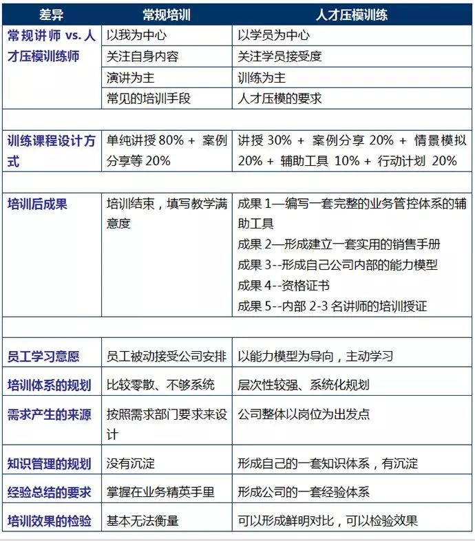 一、(1)工業品企業營銷人才培養的8大困惑 1.新人的人數增長非常快,沒有系統化的培訓,就直接投向市場,導致無法勝任崗位的要求,得罪客戶,維護困難,影響銷售; 2.新人自己出不了單,導致積極性不高,激情不夠,培訓不足,心態受到了很大的打擊,導致人才流失,成本較高; 3.老人基本上缺乏有效的管理經驗,業務出身,銷售能力較強,但是無法帶領新人,或帶領新人比較麻煩,與其讓培養,不如自己干,無法勝任管理崗位的要求; 4.目前沒有一套成熟的經驗或者體系,來有效地復制或培養新人,導致經驗無法提煉,更沒有相應的銷售手冊,經典案例來培養他人; 5.目前,公司的培訓體系不夠完善,基本上靠外部培訓為主,內部無論是從經驗的角度、文化的傳承,費用可以更節約一些,因此內部成立培訓師隊伍就非常重要; 6.銷售系統人事管理工作全部壓在直線經理身上,人力資源管理缺位導致其功能不能充分發揮 ; 7.銷售系統缺乏人力規劃,人員需求和供給靠感覺,缺乏整體感造成不協調,人員招聘的隨意性大; 8.公司的人員培訓缺乏或培訓體系不完善,缺乏培訓的需求分析和培訓總結,培訓的實施簡單,員工發展后勁不足。 一、(2)工業品營銷人才壓模培訓系統的定義 針對目前中國工業品企業上述諸多問題和現狀,“工業品營銷研究院”圍繞工業品營銷人才必備的能力,特開設基于能力為導向的“工業品營銷人才壓模訓練系統”。是基于17年來工業品營銷研究院300多家工業品企業的咨詢經驗,3000多家工業企業營銷培訓的深厚經驗,主要是為批量復制工業品營銷人才,使工業企業營銷團隊新人能力提升更快,老銷售人員的能力培養更加系統化規范化,使公司的營銷更加的切實有效,并且能夠書面化、流程化、體系化的一個訓練系統,讓營銷知識技能得以傳承,并在訓練后對其進行評估、認證,考核合格后正式上崗。 二、工業品營銷人才訓練模塊——專業性、針對性、系統性 ![]() 三、工業品營銷人才壓模的訓練方式 ![]() 四、(1)常規工業品營銷業務管理現狀 第一階段:粗放式管理 優點:單兵作戰,只關注結果,管理簡單。 缺點:難以控制過程,新人流失率極高,業績瓶頸。 第二階段:漏斗式管理 優點:對項目進行階段劃分,強調團隊配合和過程管控,管理效率顯著提升。 缺點:缺乏策略、技巧、輔助工具,屬于半自動化的管理工具。 第三階段:流程式管理 優點:對項目進行階段劃分,強調團隊配合和過程管控,強調階段性成果,并將管理制度、策略、技巧、輔助工具融為一體,管理效率大幅提升,屬于全自動化的管理工具。 缺點:對銷售管理人員的素質提出了較高的要求,需要系統的培訓。 四、(2)標準化工業品業務流程管控系統 ![]() 五、課程大綱【課程主題1】 建立標準化的工業品業務流程體系 — 天龍八部 一、建立工業品業務流程體系-“天龍八部” 工業品營銷的五大特征 粗放業務營銷與精細業務管理 標準化業務開發的推進流程(工程項目) 第一部:項目立項(10%) 第二部:深度接觸(20%) 第三部:方案設計(25%) 第四部:技術交流(30%) 第五部:方案確認(50%) 第六部:項目評估(75%) 第七部:商務談判(90%) 第八部:合同執行(100%) 工業品業務配套的推進流程(工業配套) 第一部:客戶評估(10%) 第二部:方案設定(20%) 第三部:深度接觸(30%) 第四部:樣品實驗(50%) 第五部:小批試用(60%) 第六部:簽訂合同(80%) 第七部:批量確認(90%) 第八部:二次銷售(100%) “上量”的業務流程管控體系 客戶服務推進流程體系 銷售里程碑與標準管理 銷售成交管理系統 項目性階段輔助工具 分析討論:我們推進項目的每一個階段標準與條件是什么? 二、工業品業務的操作流程-“葵花寶典” 信息收集,捕風造影“十八招” 發展線人,搞定小秘 引導需求,技術壁壘 利用線人,搞定高層 標書制作,關系平衡 商務談判,合同風險 催款技巧, 項目推進 案例分析:項目到了這一步,我該怎么辦? 三、工業品“天龍八部”銷售分析與管理 銷售人員如何來提升銷售階段? -----業務流程管理的四大原則 如何利用輔助工具促進業務流程的推進? -----過程導向勝于結果 -----過程分析與項目推進 -----銷售漏斗運用方法 銷售人員如何運用“天龍八部”進行費用分析 案例分享:8000元的營銷費用花還是不花? 如何運用“天龍八部”進行問題診斷? 精細化管控的三大要素 業務階段分析的可行性方法 四、工業品“天龍八部”管理工具運用 1,銷售手冊 2,經典案例集 3,策略規劃庫 4,PSM軟件工具 案例討論:ABB的漏斗運用。 【課程主題2】 工業品營銷各里程碑實戰七步分析法 1、明確規范化的業務流程體系 明確公司的業務模式(OEM配套、大客戶、項目、ODM) 明確具體的業務流程體系(天龍八部、七部、服務體系的五部) 2、明確業務流程體系的里程碑 針對具體的業務流程體系進行分解為里程碑 利用階段定義來分析具體在哪一個里程碑 3、明確里程碑的工作任務清單 把每一個里程碑分解為3—7個工作任務清單 利用對具體工作任務清單的對比分析,卡在哪一個任務清單里 4、完成工作任務清單的日常活動 針對每一個工作任務清單,進行歸納總結:所有的日常活動 明確本次,營銷運用哪一項的日常活動,進行選擇; 5、每一個日常活動必須達成目的 根據日常活動,進行一一對應,確保拜訪或電話的目的; 目的導向,每一次實現1個小目標,就是未來大目標 6、達成目的,需要的具體策略方法 為
