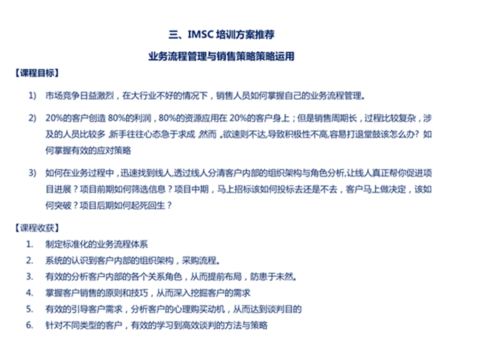 企業(yè)背景:魯西化工集團股份有限公司,是1998年3月經(jīng)中國證監(jiān)會的批準,于1998年5月在深圳證券交易所掛牌交易的上市公司,股票代碼:000830,股票簡稱:魯西化工。產(chǎn)業(yè)涉及化工、化肥、裝備制造安裝及化工研究設計,具有年產(chǎn)400萬噸化工產(chǎn)品、350萬噸化肥產(chǎn)品的生產(chǎn)能力,化工裝備年制造能力15萬噸以上;“魯西牌”復合肥為“中國名牌產(chǎn)品”。 2017.7.18日工業(yè)品營銷研究院受邀為魯西化工集團股份有限公司開展《業(yè)務流程管控與管理》的系列培訓,本次培訓的主講老師是工業(yè)品營銷研究院的丁老師。 幽默風趣、一針見血、內容實用有效、是丁老師的教學風格,能讓學員們真正達到學以致用的目的。教學中脈絡清晰的案例分析,豐富經(jīng)驗總結的傳授能讓身在硝煙戰(zhàn)場的營銷學員感同深受。圖為丁老師教學中。 ![]() 丁老師的教學注重實務性、突出實戰(zhàn)性、理順思維并系統(tǒng)化、傳授最新、最先進并且行之有效的營銷戰(zhàn)略及經(jīng)驗。以案例分析、模擬實驗、小組討論及練習等方式啟發(fā)思維、愉快的課堂氣氛,所到之處學員受益非淺。 ![]() 魯西化工集團此次培訓的項目背景如下:為了提升銷售人員的業(yè)務流程分析能力,掌握項目每一步應使用的銷售策略。希望培訓可以達到的要求是:提升銷售人員業(yè)務過程中的分析能力,掌握業(yè)務中每一步流程的策略及方法提高與客戶的談判以及回款能力。 ![]() 工業(yè)品營銷研究院針對魯西化工集團所要達到的培訓目標以及要求,擬定出了以下的培訓方案。 ![]() 短暫的培訓在輕松的氛圍中結束了,學員們表示第一次感受到培訓可以這么輕松,又能學習到很多技巧,魯西化工集團的領導對工業(yè)品營銷研究院丁老師此次的培訓做了高度的評價,他們說學習了業(yè)務流程管控與管理讓我們銷售工作也和生產(chǎn)一樣,不僅是可以做到流程管控,同時也可以有效的防止個人英雄主義,讓所有的銷售人員都可以為公司創(chuàng)造高價值。做到每個單子都可以心中有數(shù),即便是項目失敗,也能夠清晰的了解是哪一個環(huán)節(jié)出的問題。所以結果很重要,過程比結果更重要。 |