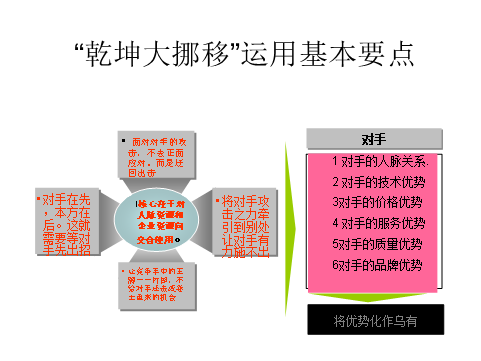 應對競爭對手的攻擊,不僅是取得的一場戰斗勝利,更應取得一張戰爭的勝利。讓競爭手中的王牌一一打掉,不給對手還擊或卷土重來的機會。就如案例中,調開宋副廠長,拿掉標的只是這場戰斗的勝利。將宋副廠長調離關鍵崗位,才是取得這場戰爭的勝利。不給對手留機會。這是乾坤大挪移的殺手锏。