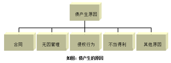綜上所述,債是一種民事法律關系,其發生必須基于一定的法律事實。能夠引起債的關系發生的法律事實就是債的發生原因,在我國債的發生原因主要有以下幾類,如圖: