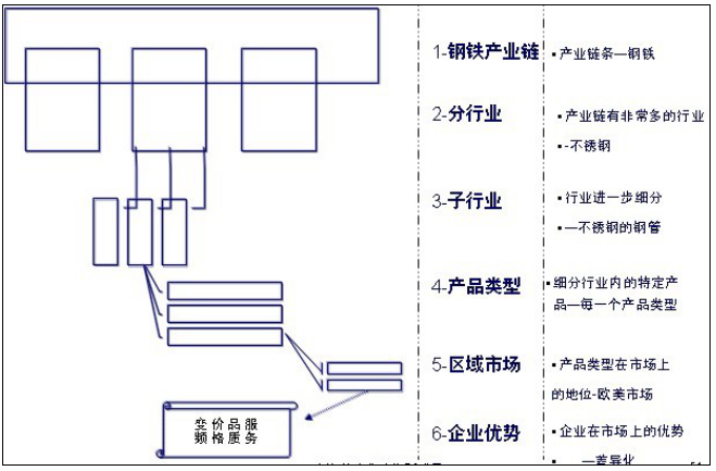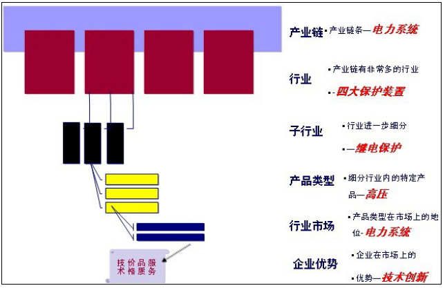 案例分享:思考上海騰達是如何進行市場戰(zhàn)略分析的? 上海騰達自控有限公司是一家專業(yè)從事自動化儀表制造、工程成套和經營的中外合資企業(yè)。上海騰達自控有限公司采用工業(yè)超市的模式,進駐中國市場。不僅有自主研發(fā)的產品,而且還是美國、日本等國多家公司自控產品中國市場的主要代理商,有多年的推廣及應用國內外公司自控產品的經驗,上海騰達由于精準的市場分析和戰(zhàn)略定位,短短幾年中成為中國市場的最大銷售業(yè)績代理商。 在過去的幾年中,上海騰達的產品已被電力、石油、化肥、化工、輕工、玻璃、造紙、冶金、水廠、鍋爐等多個行業(yè)的用戶采用,業(yè)務遍及全中國。為做好用戶售前、售中及售后服務,上海騰達在全國各地設立有二十多個分公司和辦事處,在香港和深圳設有設計制造和培訓中心,可以為用戶提供系統(tǒng)設計、成套制作、產品銷售、現場投運、用戶培訓等服務。從ABB,松下,飛利浦,可口可樂,柯達這些著名跨國公司到寶鋼,華能電力,金陵石化,浦東機場,上海騰達的產品和服務已進入到中國的數千家企業(yè),獲得各界客戶的普遍認同和良好贊譽。 上海騰達以合作共贏作為企業(yè)的經營方針,通過同國外公司的合作、合資、代理的方式,把國際上最新的技術和資本引進到中國,促進先進技術在中國的應用,并取得了驕人的業(yè)績。通過上海騰達的成功,我們一步一步揭開工業(yè)品市場戰(zhàn)略營銷的設計流程模式。 1、工業(yè)品市場戰(zhàn)略的六步流程分析 工業(yè)品營銷的成功必須建立在公司認識到營銷戰(zhàn)略的重要性。因為營銷戰(zhàn)略能夠使公司認識到各種各樣的市場變化和機會,并迅速地做出反應。 根據我們長期的工作經驗積累,我們認為工業(yè)品市場戰(zhàn)略應該按照以下流程來設計: ![]() 1.1第一步:分析產業(yè)鏈 工業(yè)品隨著技術的發(fā)展,生產程度的提高,生產過程劃分為一系列有關聯(lián)的生產環(huán)節(jié)。分工與交易的復雜化對使得在經濟中通過什么樣的形式聯(lián)結不同的分工與交易活動成為日益突出的問題。因此,搜尋一種企業(yè)組織結構以節(jié)省交易費用并進一步促進分工的潛力,相對于生產中的潛力會大大增加。企業(yè)難以應付越來越復雜的分工與交易活動,不得不依靠企業(yè)間的相互關聯(lián)。這種搜尋最佳企業(yè)組織結構的動力與實踐,成為產業(yè)鏈形成的條件。 產業(yè)鏈是一個概念,是各個產業(yè)部門之間基于一定的技術經濟關聯(lián),并依據特定的邏輯關系和時空布局關系客觀形成的鏈條式關聯(lián)關系形態(tài)。產業(yè)鏈主要是基于各個地區(qū)客觀存在的區(qū)域差異,著眼發(fā)揮區(qū)域比較優(yōu)勢,借助區(qū)域市場協(xié)調地區(qū)間專業(yè)化分工和多維性需求的矛盾,以產業(yè)合作作為實現形式和內容的區(qū)域合作載體。 產業(yè)鏈的本質是用于描述一個具有某種內在聯(lián)系的企業(yè)群結構,它是一個相對宏觀的概念,存在兩維屬性:結構屬性和價值屬性。產業(yè)鏈中大量存在著上下游關系和相互價值的交換,上游環(huán)節(jié)向下游環(huán)節(jié)輸送產品或服務,下游環(huán)節(jié)向上游環(huán)節(jié)反饋信息。 產業(yè)鏈分析主要是用于分析產業(yè)間差異(不同業(yè)務的價值差異),幫助企業(yè)找到富有價值與發(fā)展前景的具體業(yè)務。基本上,產業(yè)鏈的分析方法是: ●定性分析方法:邁克爾·波特的五種力量競爭模型。 ●定量分析方法:產業(yè)鏈利潤 >利潤結構分析。 案例分享:上海騰達是如何分析電力系統(tǒng)產業(yè)鏈的前景? 上海騰達從國外引入新產品技術進來中國市場時,總會先分析該產品在產業(yè)鏈上的前景。以下是上海騰達引入電力系統(tǒng)產品時的分析思路。 電力系統(tǒng)的產品是一個較為特殊的產品,從供應鏈的角度上來講,這一產業(yè)的主要產品是能源產品,也就是電能,是全社會的吃穿住行和人們生活需要的公用產品。按照產品生產銷售供應鏈的這一條主線,電力行業(yè)供應鏈大致可以分為發(fā)電、輸電、配電和電能銷售等幾個環(huán)節(jié)。其中發(fā)電主要任務進行電能產品的生產,這一環(huán)節(jié)的主要企業(yè)就是發(fā)電廠;輸電可以理解為與普通行業(yè)中的產品運輸相對應,輸電網也就是運輸電能產品的 “ 高速公路 ” ,與這一環(huán)節(jié)打交道部門和企業(yè)有調度中心 ( 主要負責輸電網絡運行安全 ) ,電力公司的網絡設施維護部門 ( 有點類似 “ 公路維護 ”) ;配電是電能產品的配送,相關部門主要是供電局 ( 公司 ) 負責配電網絡的運行與安全的部門等;電能銷售則包括電能的批發(fā) ( 躉售 ) 和零售,相關部門是電力公司的營銷部 ( 或者用電部 ) 等。 由于電能已經成為人們日常生產和生活中消耗的主要能源,不論城市或農村,不論生產或生活,不論信息傳遞或網絡聯(lián)系,家庭生活都離不開電,是一種對社會是全方位的覆蓋。一個國家電氣化水平越高,電力在全社會作用越大。使得電力工業(yè)成為關系到國計民生方方面面的基礎行業(yè)。 電力產業(yè)另一個特點是它的產品不能儲存,發(fā)電量超過需要量會形成浪費,發(fā)電量不足,會影響生產和生活的需要。而且,社會對電量的需要是一個不定量,它會